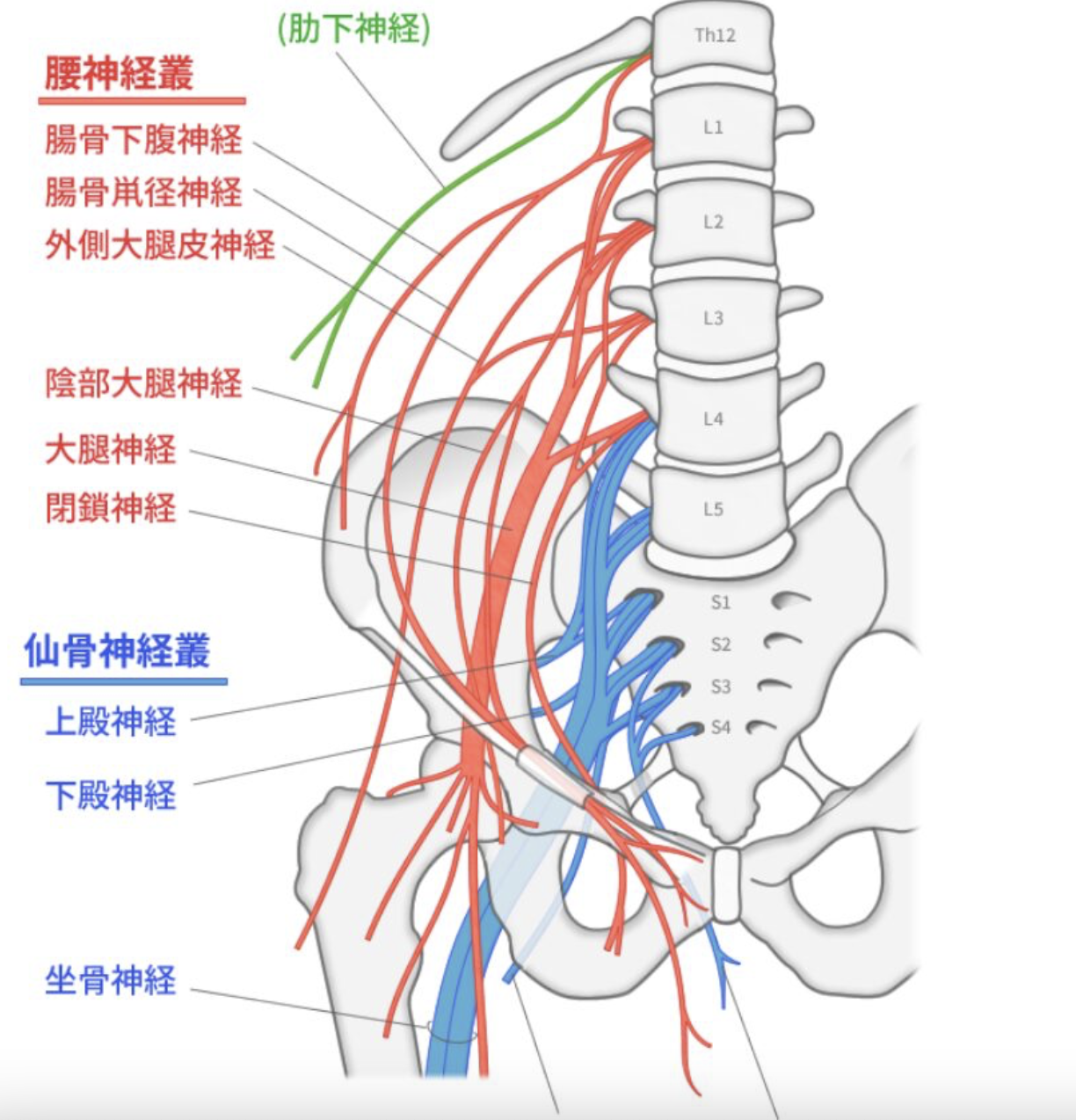 股関節周囲には末梢神経が前後内外側に様々な神経が通っています。